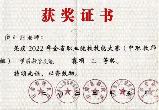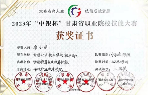 在2022年至2023年期间,连续两年荣获甘肃省技能大赛教师组三等奖,并在2023年荣获“中银杯”甘肃省职业院校技能大赛指导教师奖,充分展现了她“既能教又会导”的硬核实力。