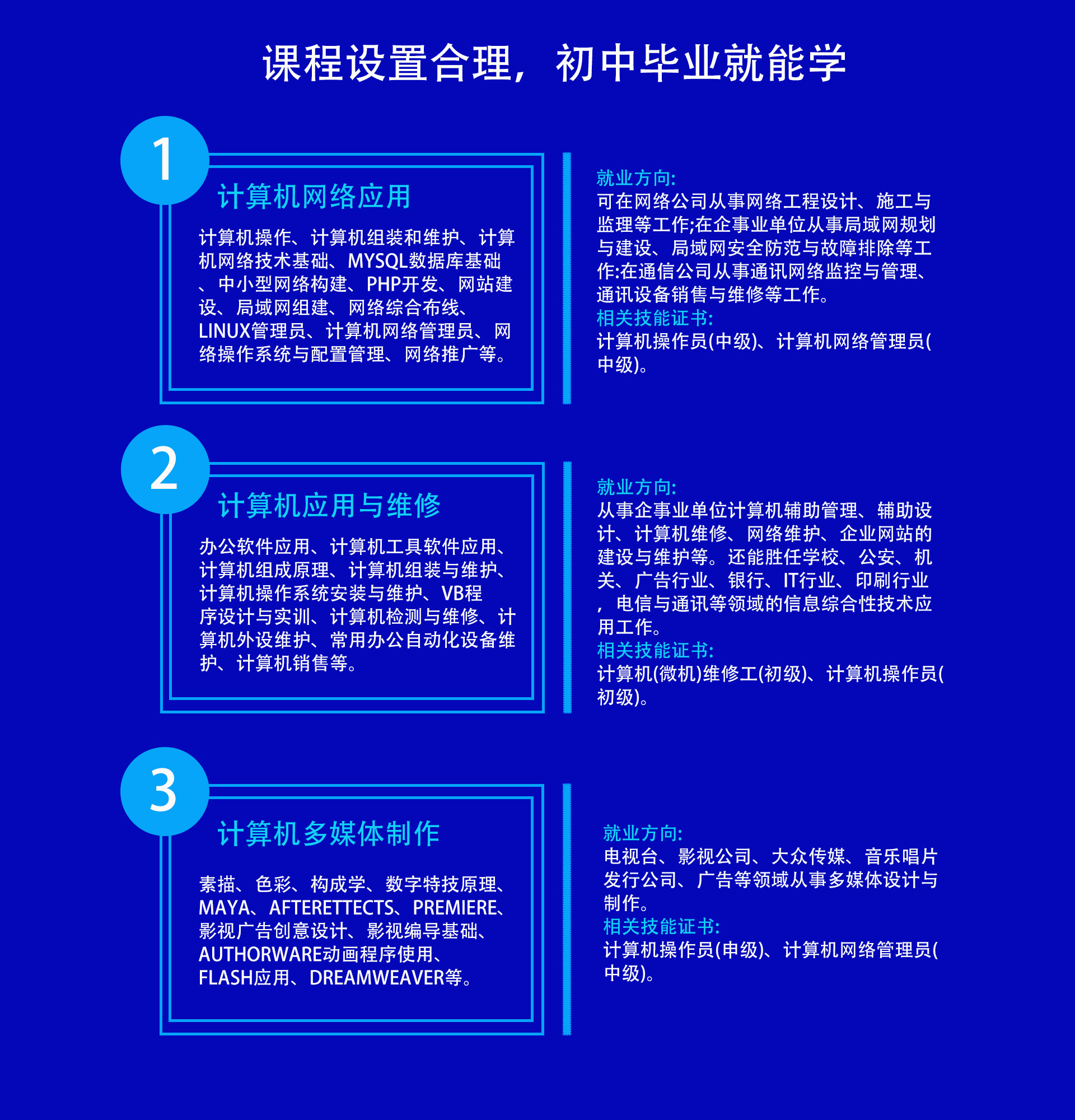 不知道是否适合学? I don't know if it's suitable for learning ? 让老师为您解答 毕业后可以拿什么学历? What degree can I get after graduation? 让老师为您解答 学完后可进哪些企业? What enterprises can I enter after ? 让老师为您解答 学成后薪资有多少? What is the salary after completion? 让老师为您解答 学费多少钱? How much is the tuition? 让老师为您解答 不知道选择什么专业好? I don't know what major to choose ? 让老师为您解答